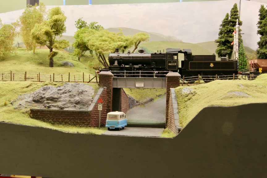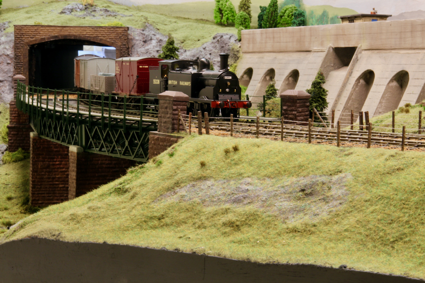 Nearly all the buildings on the layout, together with the viaduct and dam have been scratch built. The station building is that at Newtonmore and the viaduct is a double track version of those on the West Highland Line.
